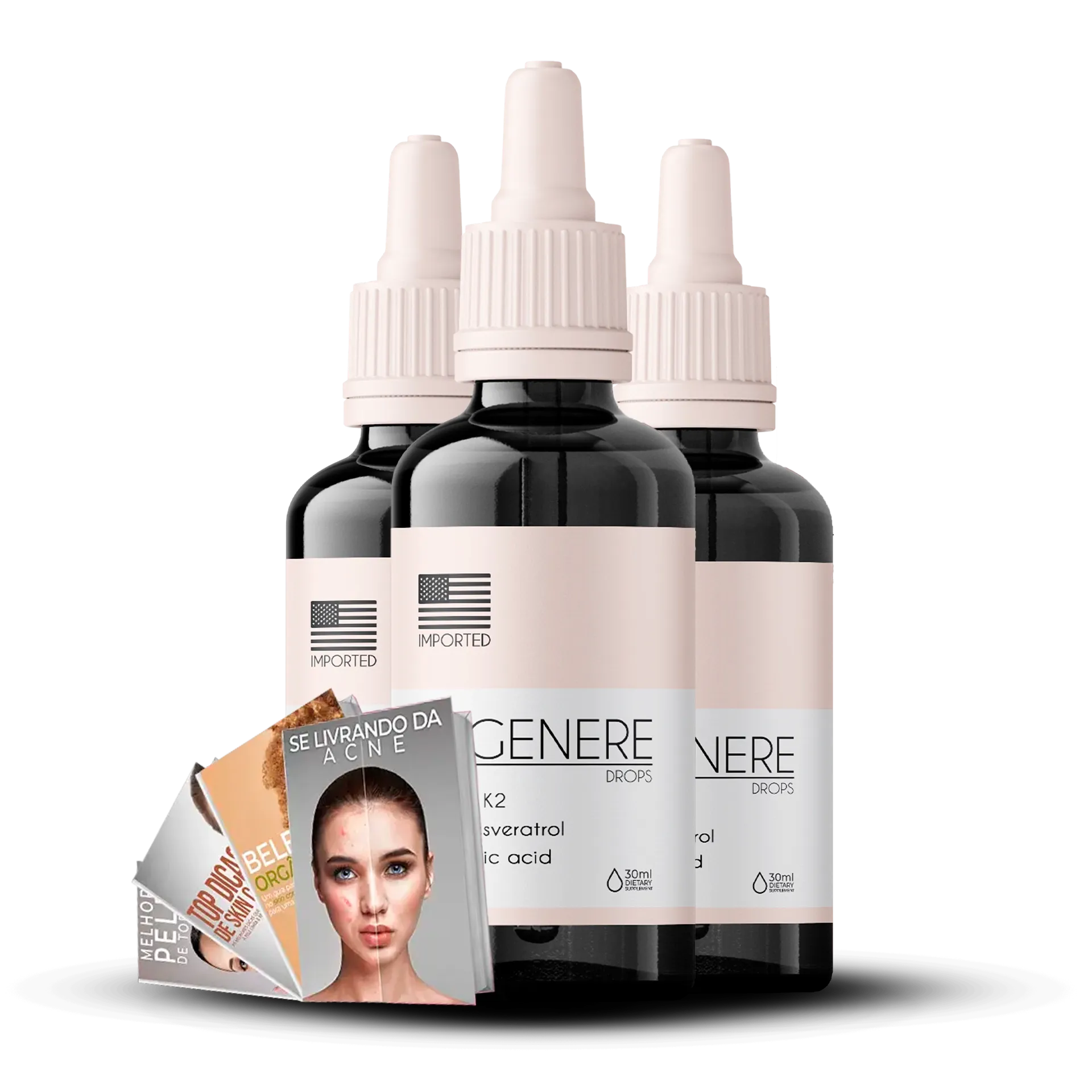 O Regenere Drops é um suplemento em gotas sublinguais desenvolvido para rejuvenescimento da pele e promoção da longevidade, combatendo sinais de envelhecimento como rugas, flacidez e manchas. Sua fórmula exclusiva, baseada em tecnologia americana, garante até 97% de absorção rápida pelos vasos sanguíneos sob a língua, eliminando a necessidade de tratamentos invasivos. Os principais ingredientes incluem Vitamina K2 (renovadora e anti-envelhecimento), TransResveratrol (pró-longevidade, antioxidante, cardioprotetor e neuroprotetor), Ácido Hialurônico (hidratação e preenchimento da pele), Verisol® (colágeno focado na pele para firmeza e elasticidade) e Retinol (estimula renovação celular).